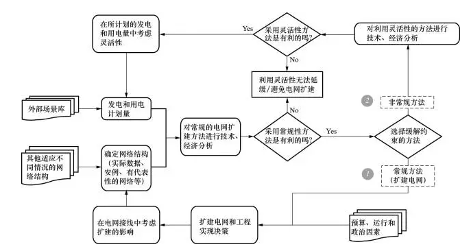 目前,法國配電公司(ERDF)正在研究如何利用發(fā)電側(cè)和需求側(cè)的靈活性來緩解電壓、線路傳輸容量的限制,從而避免/延緩電網(wǎng)擴(kuò)建的問題,文獻(xiàn)[13]就此給出了一個(gè)通用框架(如圖4所示),對常規(guī)的電網(wǎng)擴(kuò)建方法和利用電網(wǎng)靈活性的方法進(jìn)行技術(shù)、經(jīng)濟(jì)比較,選擇成本效益最高的作為最終方案。發(fā)電、用電資源的靈活性是從容量、持續(xù)時(shí)間和頻率等幾方面來定義的,而這不僅需要負(fù)荷持續(xù)時(shí)間曲線,還需要隨機(jī)時(shí)序負(fù)荷曲線,其預(yù)測方法也是ERDF目前正致力于研究的一個(gè)領(lǐng)域。在進(jìn)行技術(shù)、經(jīng)濟(jì)比較時(shí),主要是比較采用某方案所需要的成本和該方案能夠減少電量不足期望值(ExpectedEnergyNotSupplied,EENS)所帶來的收益,如果前者小于后者,則該方案是具有成本效益的。另外,文獻(xiàn)[13]認(rèn)為,雖然在有些情況下利用電網(wǎng)靈活性可能很難達(dá)到電網(wǎng)擴(kuò)建后高可靠、高質(zhì)量的供電,但是如果能夠獲得較好的成本效益,利用電網(wǎng)靈活性來推遲電網(wǎng)擴(kuò)建也是合理的。
