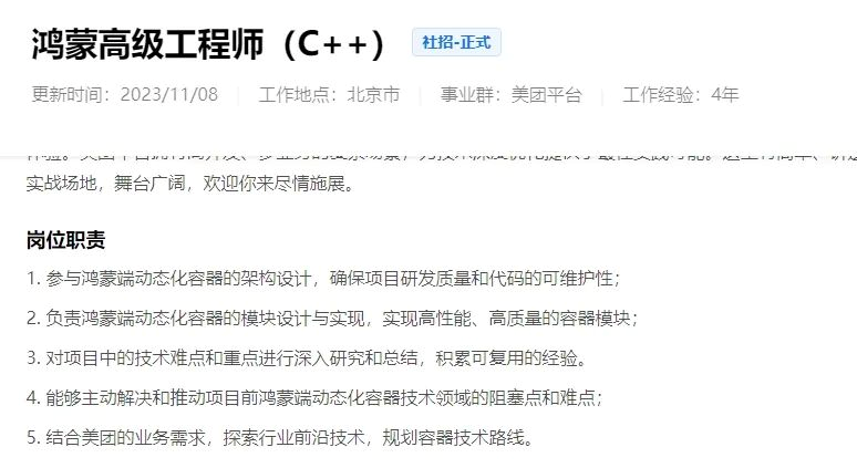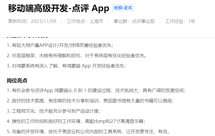 美團發(fā)布了鴻蒙高級工程師、鴻蒙基建工程師等多個鴻蒙開發(fā)相關崗位。主要開發(fā)美團鴻蒙App、大眾點評鴻蒙App。網易更新了高級/資深Android 開發(fā)工程師崗位,職位要求參與云音樂多端多OS的產品(Android、鴻蒙等)研發(fā)迭代。