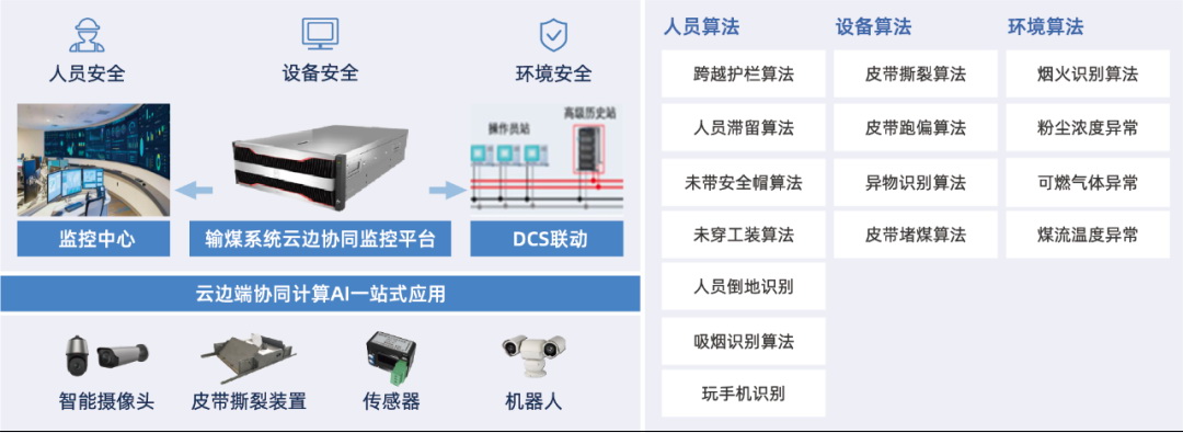 方案通過云邊端協(xié)同架構把智能采集裝置、皮帶撕裂識別裝置、環(huán)境傳感器等進行數(shù)據(jù)的統(tǒng)一匯聚分析,對異常情況進行識別和報警,并通過DCS系統(tǒng)控制聯(lián)動,提高人員、設備、環(huán)境的安全管理水平。 在設備故障監(jiān)測方面,可對皮帶異物、落煤口堵煤、皮帶跑偏、運行環(huán)境火花等情況進行識別,避免異物運輸對皮帶造成意外損傷或引發(fā)事故;在人員安全管控方面,設置吸煙、安全帽佩戴、翻越護欄、人員倒地等相關算法,對巡檢人員的不安全行為進行識別管控;在環(huán)境監(jiān)控方面,通過安裝布設有毒有害氣體監(jiān)測傳感器、溫度傳感器、粉塵監(jiān)測傳感器等對輸煤環(huán)境進行在線實時監(jiān)測,及時發(fā)現(xiàn)高溫、有毒有害氣體超標、粉塵濃度超標并預警,最大程度保障人員操作環(huán)境安全。