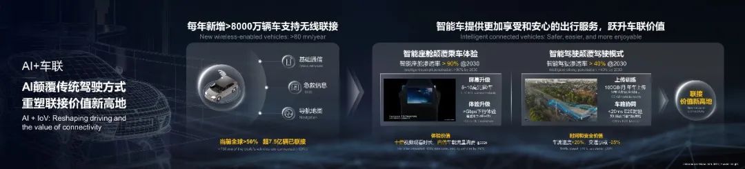 第二,智能網(wǎng)聯(lián)汽車將顛覆傳統(tǒng)駕駛方式,提供更加愉悅和安心的出行服務。智能座艙,將顛覆人們的乘車體驗。Gbps網(wǎng)絡體驗支持智慧助手、多屏觀看和XR應用等需求,使車輛成為集休閑、娛樂和工作于一體的'移動第三空間'。智能駕駛,將顛覆傳統(tǒng)的駕駛模式。通過每月百GB的數(shù)據(jù)上傳訓練,智駕系統(tǒng)不斷提高模型準確性,精準識別和響應多樣化交通環(huán)境;同時,基于毫秒級的車路協(xié)同,將實時提供穩(wěn)定可靠的駕駛策略。智能網(wǎng)聯(lián)汽車將兌現(xiàn)車聯(lián)體驗價值,進一步帶來時間價值和安全價值,重塑聯(lián)接價值的新高地。