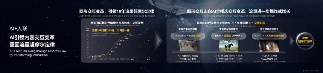 第一,圖形交互變革在過去10年推動了移動流量快速增長,DoU在過去十年增長120多倍,平均每17個月翻一番,流量增速超摩爾定律。我們認為,移動AI時代將引領(lǐng)內(nèi)容交互的再次變革,隨著生成式內(nèi)容將會取代檢索式成為主流,交互效率百倍提升;隨著AIGC將推動3D、空間視頻等全模態(tài)內(nèi)容生產(chǎn),交互信息量百倍提升;隨著終端將內(nèi)置大量本地小模型與云端大模型實時協(xié)同,交互對象百倍提升。這將將促進移動流量爆炸式增長,重回流量超摩爾定律。