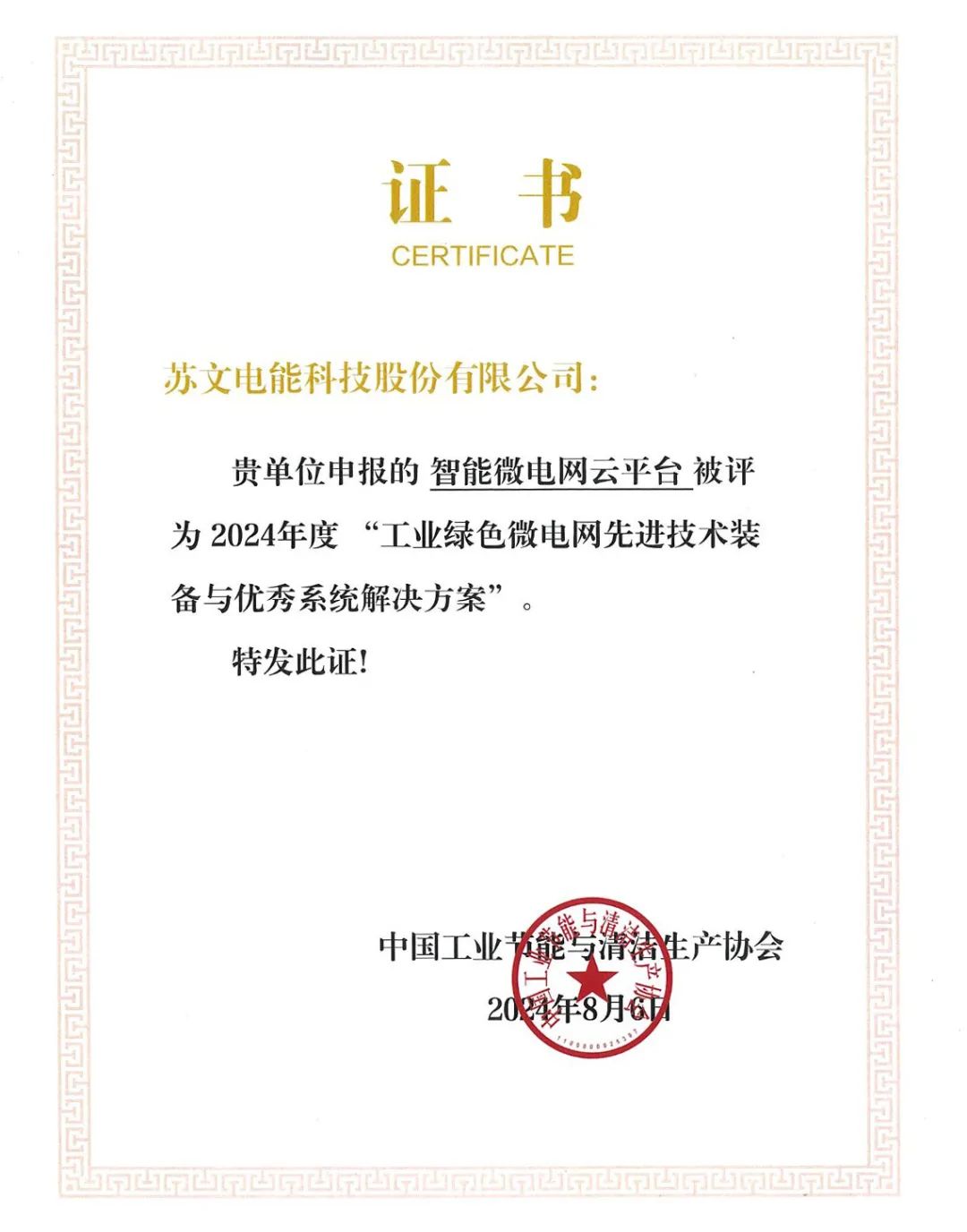 8月17日,由中國(guó)工業(yè)節(jié)能與清潔生產(chǎn)協(xié)會(huì)主辦的“2024工業(yè)綜合能效大會(huì)”順利召開,蘇文電能(300982)電能俠智能微電網(wǎng)云平臺(tái)被授予“工業(yè)綠色微電網(wǎng)先進(jìn)技術(shù)裝備與優(yōu)秀系統(tǒng)解決方案”大獎(jiǎng),這一榮譽(yù)標(biāo)志著,蘇文電能在工業(yè)節(jié)能環(huán)保領(lǐng)域所作出的突出貢獻(xiàn)。