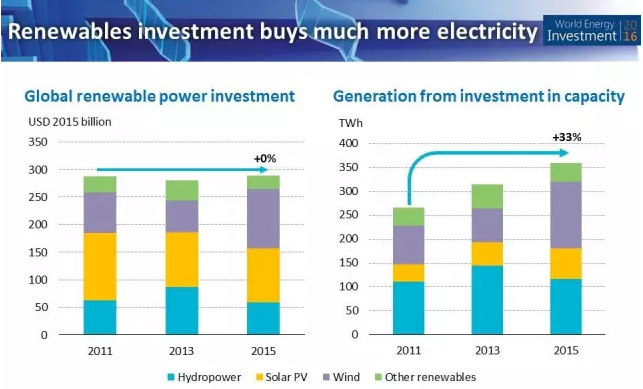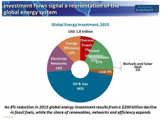 2015年電力行業(yè)投資達(dá)到了創(chuàng)紀(jì)錄的6900億美元,超過(guò)能源總投資的37%??稍偕茉赐顿Y占17%,約占了電力投資的一半??稍偕茉赐顿Y中,16%來(lái)自發(fā)電,生物和太陽(yáng)能只占1%。