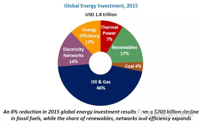 雖說油氣投資大幅下降,但是在全球1.83萬億的能源投資總額中,油氣投資占比達到46%??稍偕茉赐顿Y占17%;火電發(fā)電廠投資占7%,電力輸配網投資占14%;能效投資占12%;煤炭開采和運輸投資僅占4%。