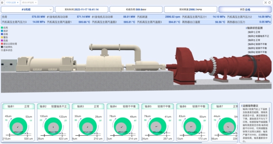 (兩張)圖注:系統(tǒng)主機(jī)首頁可集中顯示汽輪發(fā)電機(jī)組/輔機(jī)運(yùn)行狀態(tài),實(shí)時(shí)監(jiān)視軸承振動(dòng)水平、重要參數(shù)的變化情況