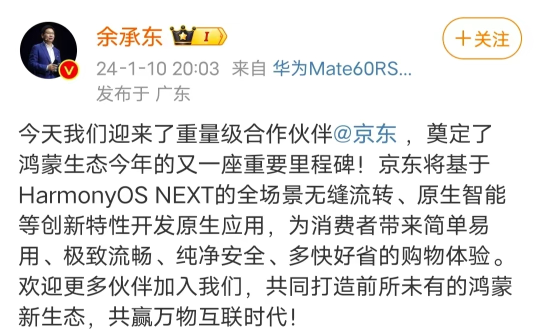 華為常務(wù)董事、終端業(yè)務(wù)CEO、智能汽車解決方案BU董事長(zhǎng)余承東在微博發(fā)文稱:“今天我們迎來(lái)了重量級(jí)合作伙伴京東,奠定了鴻蒙生態(tài)今年的又一座重要里程碑!