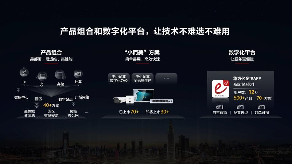 今年,我們已經(jīng)面向金融、教育、醫(yī)療、能源等行業(yè),推出了40多個(gè)產(chǎn)品組合方案,比如園區(qū)智慧安防、極簡(jiǎn)辦公網(wǎng)等,覆蓋數(shù)據(jù)中心、園區(qū)、數(shù)字站點(diǎn)、廣域網(wǎng)絡(luò)等場(chǎng)景,基本上可滿足企業(yè)數(shù)字化轉(zhuǎn)型中90%的數(shù)字基礎(chǔ)設(shè)施需求。