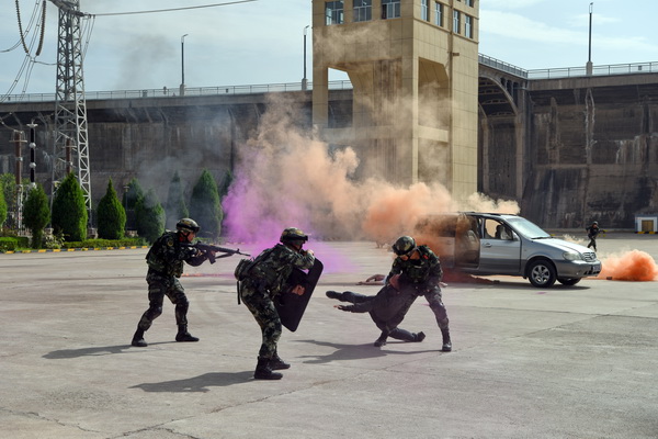 此次演練模擬恐怖分子挾持施工單位車輛,偽裝成施工人員在上班高峰期混入生產(chǎn)區(qū)域,并攜帶爆炸物意圖對(duì)大壩、330千伏開(kāi)關(guān)站等重點(diǎn)部位實(shí)施爆炸破壞,在尋找時(shí)機(jī)實(shí)施破壞活動(dòng)時(shí)被該廠測(cè)溫人員發(fā)現(xiàn),在上前詢問(wèn)、檢查證件時(shí)恐怖分子身份暴露,隨后挾持測(cè)溫人員,強(qiáng)行進(jìn)行爆炸破壞活動(dòng),最終被駐廠武警戰(zhàn)士和縣公安局防爆警察制服并成功解救被挾持人質(zhì)為場(chǎng)景。