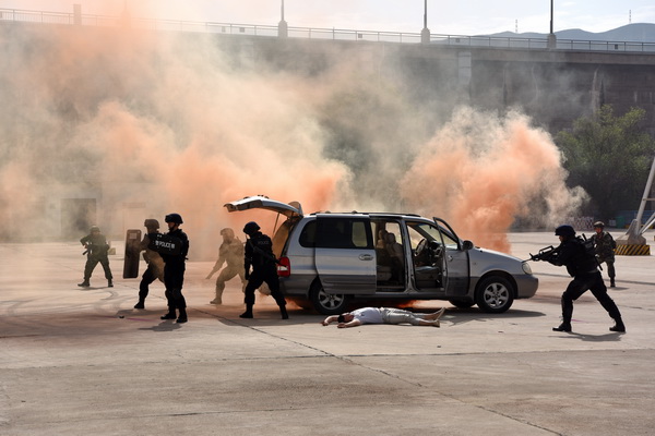 刺耳的警笛響起,縣公安局、縣消防救援大隊(duì)、醫(yī)療救援機(jī)構(gòu)車輛疾馳趕往事發(fā)地點(diǎn),3名恐怖分子與武警戰(zhàn)士、防暴警察展開(kāi)對(duì)峙。