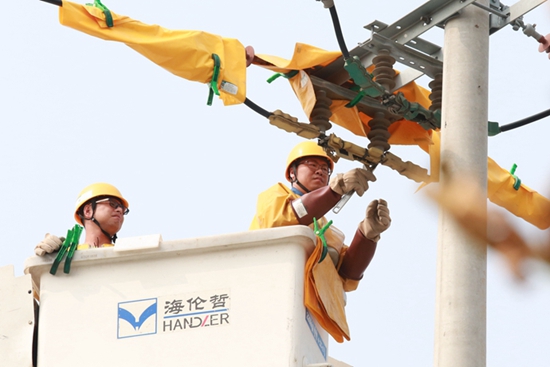中國電力網(wǎng)訊 8月11日,在濰坊壽光市胡二村,國網(wǎng)壽光市供電公司帶電作業(yè)人員冒著潮濕悶熱天氣,對10千伏胡營線塑料支線09號桿帶電更換隔離刀閘,同時對10千伏顏方線81號桿帶電校正歪斜瓷瓶,全面消除線路運(yùn)行隱患,保障初秋時節(jié)居民用電安全。