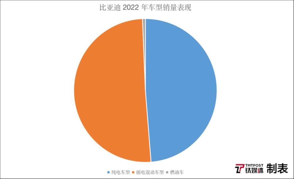 數(shù)據(jù)顯示,比亞迪 2022 年全年累計(jì)銷量達(dá)到了 186.9 萬輛,其中來自純電車型和插電混動(dòng)車型銷量分別為 91.1 萬輛、94.6 萬輛,燃油車銷量僅有 1.2 萬輛。