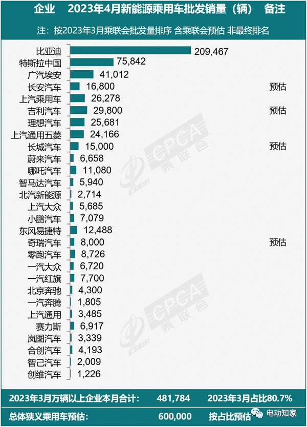 乘聯(lián)會綜合預(yù)估4月乘聯(lián)會新能源乘用車廠商批發(fā)銷量60萬輛,環(huán)比基本持平,同比增114%。乘聯(lián)會預(yù)計1-4月全國乘用車廠商新能源批發(fā)210萬,同比增長43%。乘聯(lián)會預(yù)測,2023年國內(nèi)狹義乘用車銷量為2350萬輛,新能源乘用車銷量為850萬輛,年度新能源車滲透率有望達到36%。這也意味著,年底新能源汽車滲透率將超過40%。照這勁頭,明年就可以和燃油車五五開了。(乘聯(lián)會)