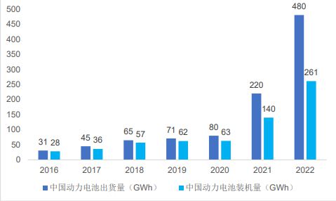 2016-2022 年中國動力電池出貨量及裝機(jī)量