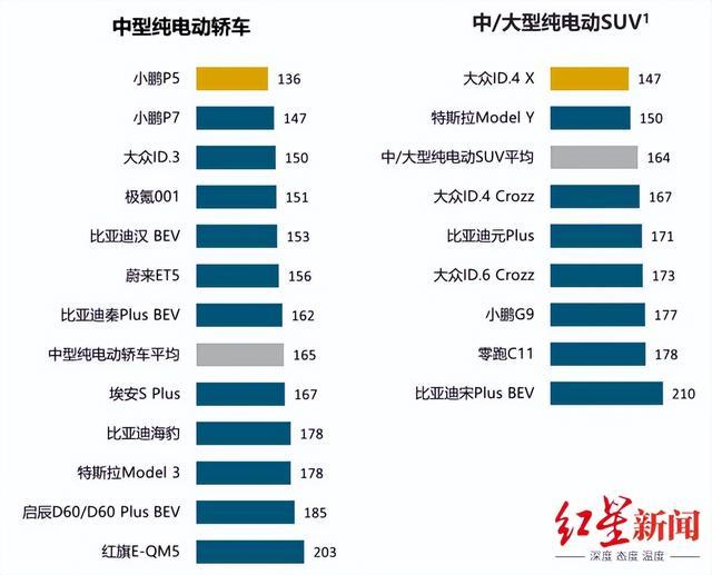 在中型純電動(dòng)轎車細(xì)分市場(chǎng),小鵬P5以136個(gè)PP100排名第一,紅旗E-QM5以203個(gè)PP100排名倒數(shù)第一,細(xì)分市場(chǎng)平均數(shù)為165個(gè)PP100。