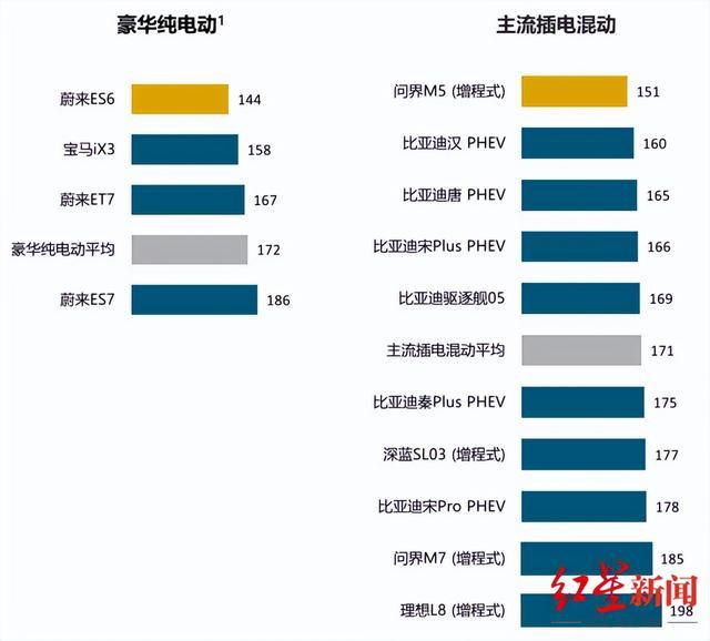 在豪華純電動(dòng)細(xì)分市場(chǎng),蔚來(lái)ES6以144個(gè)PP100排名第一,蔚來(lái)ES7以186個(gè)PP100排名倒數(shù)第一,細(xì)分市場(chǎng)平均數(shù)為172個(gè)PP100。