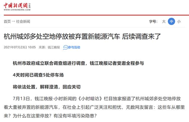 2021年7月,《錢江晚報·小時新聞》的《小時暗訪》欄目報道了杭州城郊多處空地停放大量新能源汽車一事。杭州市政府旋即部署了由市交通運輸局(管理中心、執(zhí)法隊)、市公安局(交通治安分局、交警支隊)牽頭的聯(lián)合調(diào)查小組,摸排在城市郊區(qū)集中停放的新能源汽車情況。
