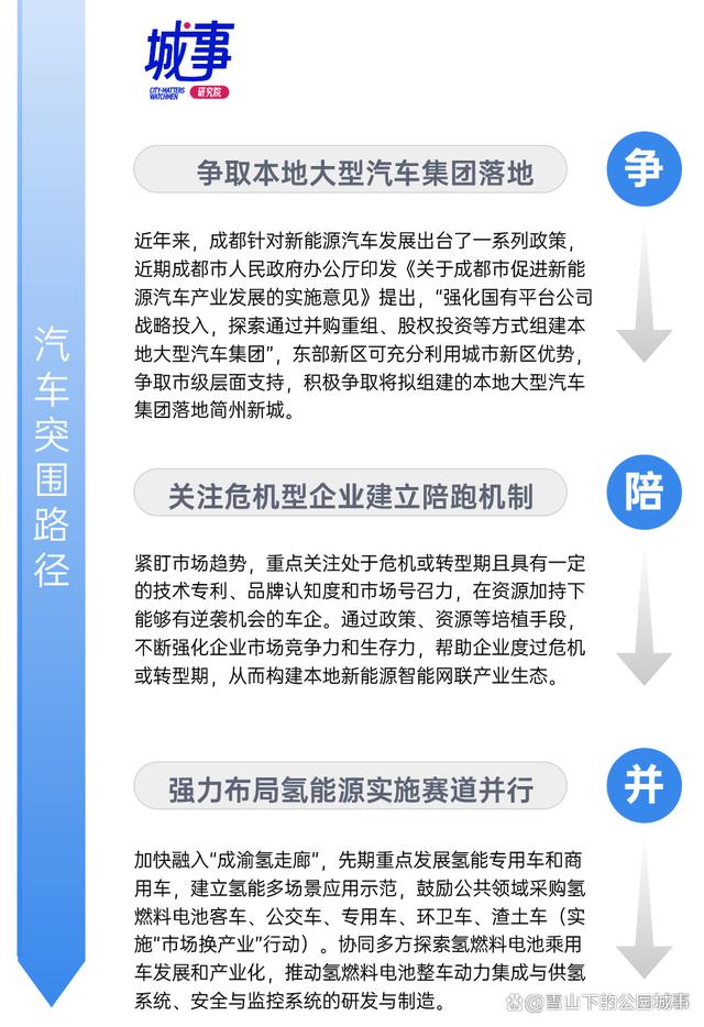 1.爭取本地大型汽車集團落地。近年來,成都針對新能源汽車發(fā)展出臺了一系列政策,近期成都印發(fā)《關于成都市促進新能源汽車產(chǎn)業(yè)發(fā)展的實施意見》提出,“強化國有平臺公司戰(zhàn)略投入,探索通過并購重組、股權投資等方式組建本地大型汽車集團”,東部新區(qū)可充分利用城市新區(qū)優(yōu)勢,爭取市級層面支持,積極爭取將擬組建的本地大型汽車集團落地簡州新城。