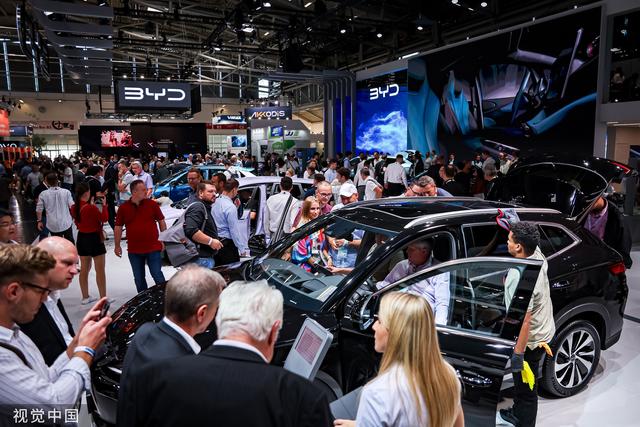 當(dāng)?shù)貢r(shí)間2023年9月6日,在德國(guó)慕尼黑舉行的2023國(guó)際車展上,參觀者在觀看中國(guó)汽車品牌比亞迪的新能源汽車。@視覺(jué)中國(guó)