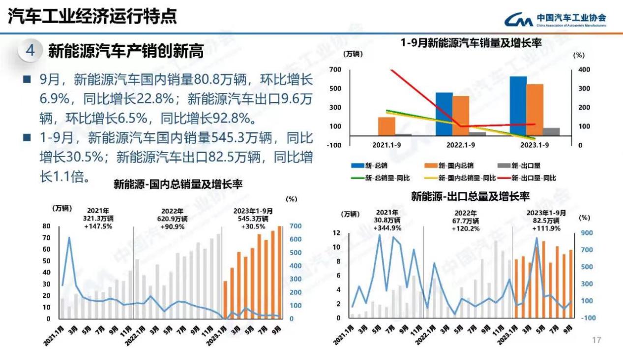 今年1月-9月,新能源汽車?yán)塾嫯a(chǎn)銷已經(jīng)達(dá)到631.3萬輛和627.8萬輛,同比分別增長33.7%和37.5%,市場占有率達(dá)29.8%。而前三季度,新能源汽車國內(nèi)銷量545.3萬輛,同比增長30.5%;出口量為82.5萬輛,同比增長1.1倍。