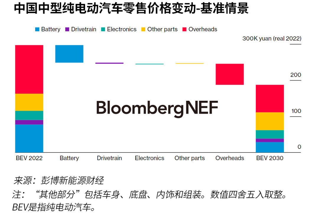 降低成本對新能源車企至關(guān)重要,因?yàn)榇蠖鄶?shù)車企尚未從新能源汽車的銷售中獲利。彭博新能源財(cái)經(jīng)估計(jì),從2022年到2030年底,電池價(jià)格下跌以及轉(zhuǎn)用專用平臺可能會使中國純電動汽車價(jià)格下降40%。結(jié)合其他零部件和系統(tǒng)的改進(jìn),這可能會推動純電動汽車在2027年至2029年間實(shí)現(xiàn)燃油車平價(jià)。更廉價(jià)的電池、平臺協(xié)同效應(yīng)和產(chǎn)業(yè)價(jià)值鏈整合也是大眾汽車和比亞迪等公司成本降低路線圖的核心。