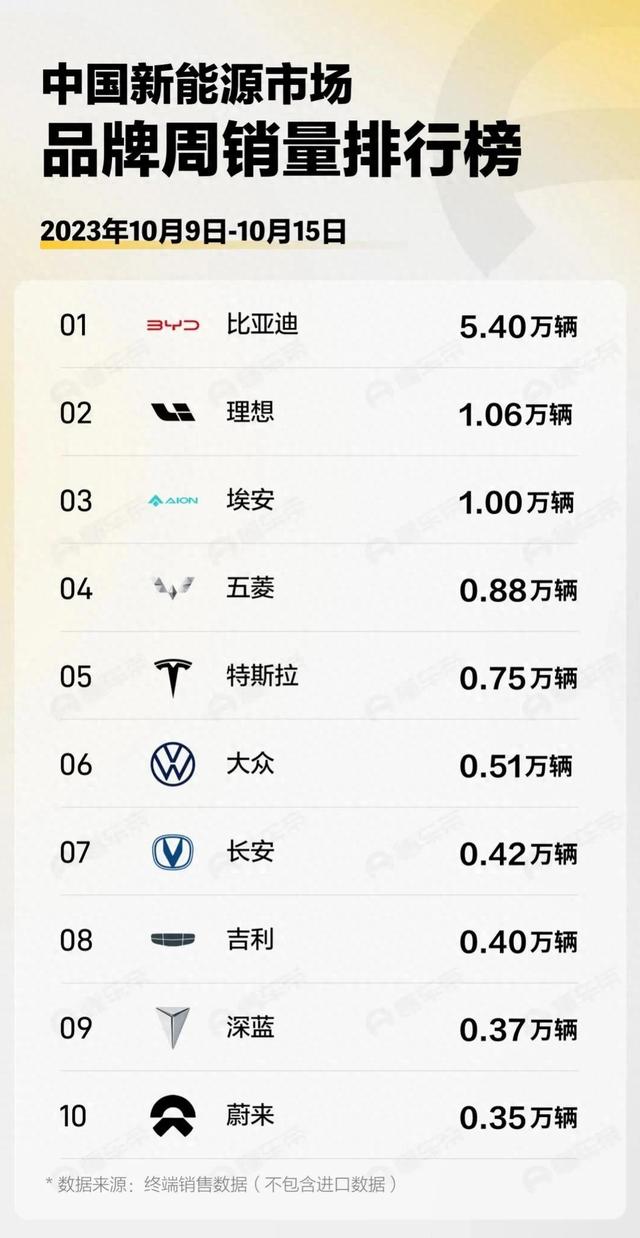 而第十名則被蔚來汽車奪取,周銷量為0.35萬輛,重新站在了銷售榜單前十的位置。蔚來汽車的再次進榜標志著他們穩(wěn)健的發(fā)展步伐,繼續(xù)在激烈的市場競爭中占據(jù)一席之地。