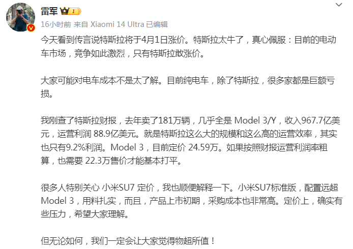 特斯拉要漲價,雷軍:真心佩服