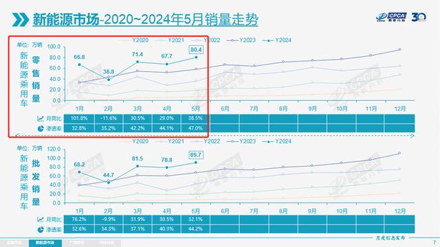 據(jù)乘聯(lián)會數(shù)據(jù),5月新能源車國內(nèi)零售滲透率達(dá)到47.0%,較去年同期33%的滲透率大幅提升了14個(gè)百分點(diǎn)。