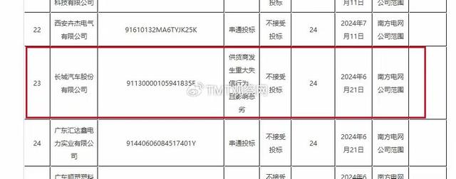 其中,長城汽車股份有限公司因“供貨商發(fā)生重大失信行為,且影響惡劣”,被列為“不接受投標”。處理期限為24個月,處理措施起計時間為2024年6月21日,處理范圍為“南方電網(wǎng)公司范圍”。