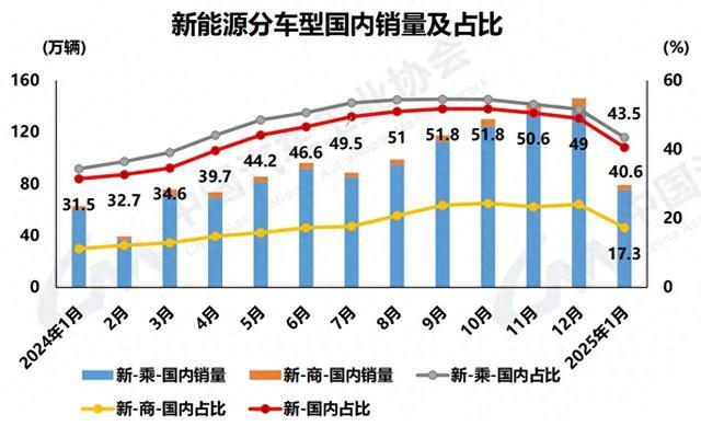 中汽協(xié)最新數(shù)據(jù)顯示,2025年1月,新能源乘用車國內(nèi)銷量占乘用車國內(nèi)銷量比例為43.5%,這一比例已經(jīng)連續(xù)4個月環(huán)比下跌,也是在去年9月達(dá)到最高點后,第二個月跌至50%以下。去年9月,國內(nèi)新能源乘用車滲透率達(dá)到歷史最高點,為54.5%。