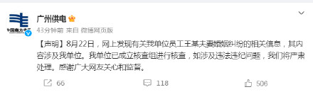 22日晚,@廣州供電 發(fā)布聲明:8月22日,網(wǎng)上發(fā)現(xiàn)有關(guān)我單位員工王某夫妻婚姻糾紛的相關(guān)信息,其內(nèi)容涉及我單位。我單位已成立核查組進(jìn)行核查,如涉及違法違紀(jì)問(wèn)題,我們將嚴(yán)肅處理。感謝廣大網(wǎng)友關(guān)心和監(jiān)督。