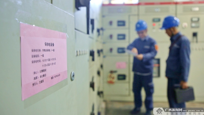 玉林供電局用電檢查人員同比賽場館配電房負責人交代用電注意事項,確保比賽期間供電穩(wěn)定可靠。佘晟 攝