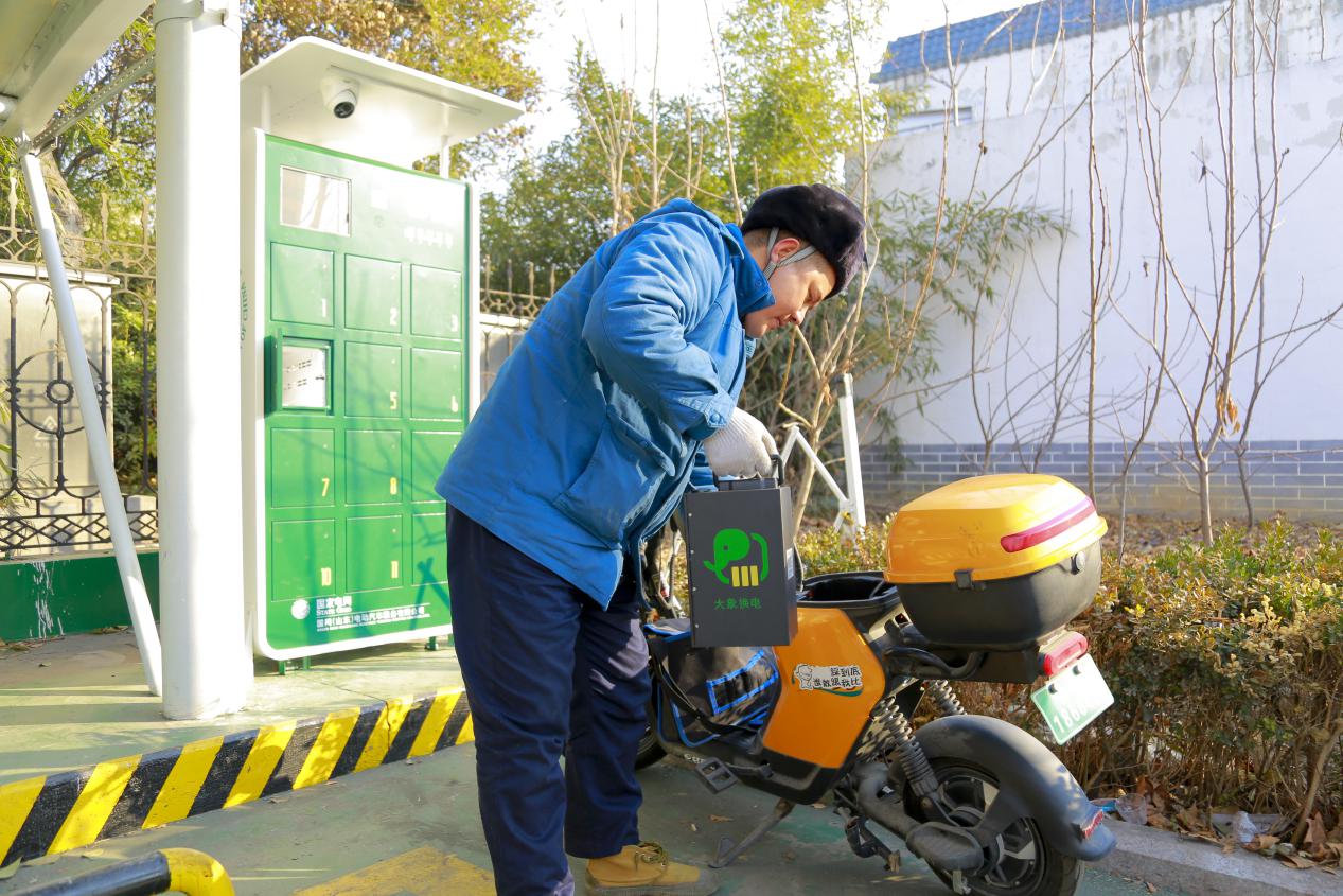 國網棗莊供電公司常莊供電所員工為現(xiàn)場檢修騎乘的“大象換電”自行車更換電池。(賈方寧 攝)