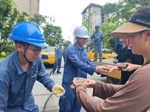 6月22日,桂林市萬達翰林府小區(qū)群眾為正在開展搶修復(fù)電的南方電網(wǎng)廣西欽州靈山供電局黨員突擊隊員們送上綠豆湯。陳心誠攝