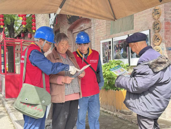 圖為國網(wǎng)渭南供電公司共產(chǎn)黨員服務(wù)隊隊員向景區(qū)商戶宣傳安全用電知識