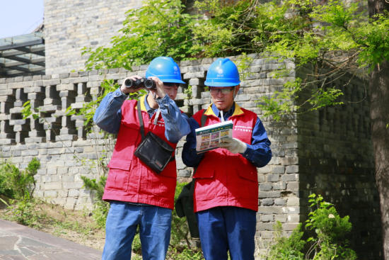 圖為國網(wǎng)渭南供電公司共產(chǎn)黨員服務(wù)隊隊員檢查景區(qū)線路運行情況