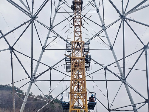 中國電力網訊 12月7日,在湖北紅安縣杏花鄉(xiāng),湖北送變電公司駐馬店一武漢1000千伏特高壓線路工程(6)標(3S219號)組塔施工現場, 項目工人正在進行抱桿拆卸施工作業(yè)。(劉偉康、郭暉)