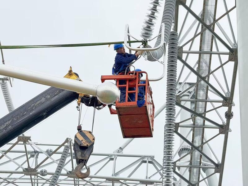 邛崍500千伏變電站內(nèi)施工人員正在安裝管母線