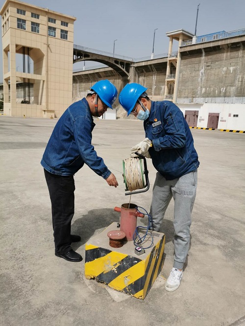 劉家峽水電站大壩的安全直接決定著下游數(shù)百萬民眾的生命財產(chǎn)安全,自該項工程開始施工便同步開展大壩觀測,按照水工安全規(guī)程與觀測規(guī)程要求,進(jìn)行變形監(jiān)測、滲流觀測和應(yīng)力應(yīng)變觀測,并對觀測數(shù)據(jù)定期整編與統(tǒng)計分析,為大壩定期檢查、鑒定提供依據(jù)。左右岸繞壩滲流水位孔測點分布在山坡上,數(shù)量多且分布范圍分散,因此測量難度非常大,人工測量不僅是體力活也是需要耐心和細(xì)心的活。“測鐘”是此次測量的重要設(shè)備,利用測鐘觸碰水面?zhèn)骰貋淼?ldquo;咚”聲音來測量水位,有些地下水位孔深達(dá)90m,用測鐘測量已經(jīng)聽不到回聲,測一個深孔就得半個小時,一百多個測點,幾十米的水深,一組“測鐘”加上線重量達(dá)十多斤,李亞洲提著“測鐘”行走在左右岸山坡間,每天天亮就上班月亮升起才下班,就這樣連續(xù)工作多天終于完成了所有地下水位孔的測量工作。