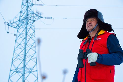 阿曼吐爾·依沙木丁在零下25攝氏度的嚴寒天,巡視海拔2000余米烏孫山上的供電線路。(國網(wǎng)伊犁伊河供電公司供圖)