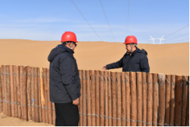 李平帶頭設(shè)計研究安裝防風(fēng)固沙柵欄,保護輸電鐵塔免遭風(fēng)沙侵移損壞。