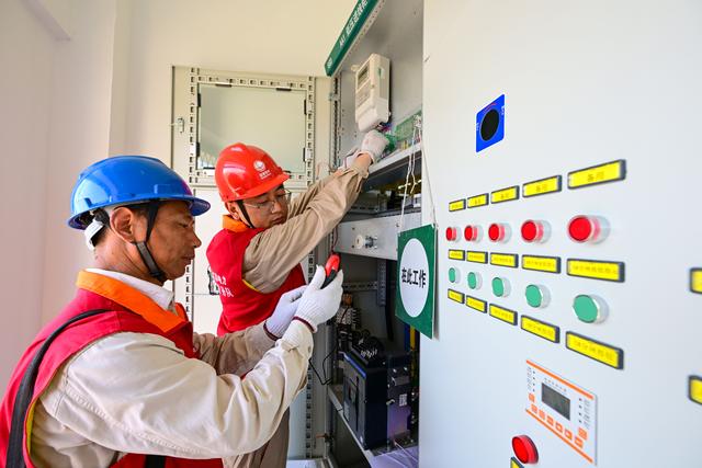 6月18日,國家電網(wǎng)江蘇電力(金湖飛虎)共產(chǎn)黨員服務隊隊員在金北街道萬莊校東泵站裝表接電,為農(nóng)田插秧抗旱提供可靠電力保障