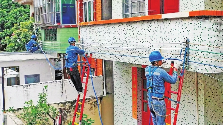 廣東電網(wǎng)公司中山大涌供電分局施工人員在安堂社區(qū)進(jìn)行“三線”整治改造。劉志彬 攝