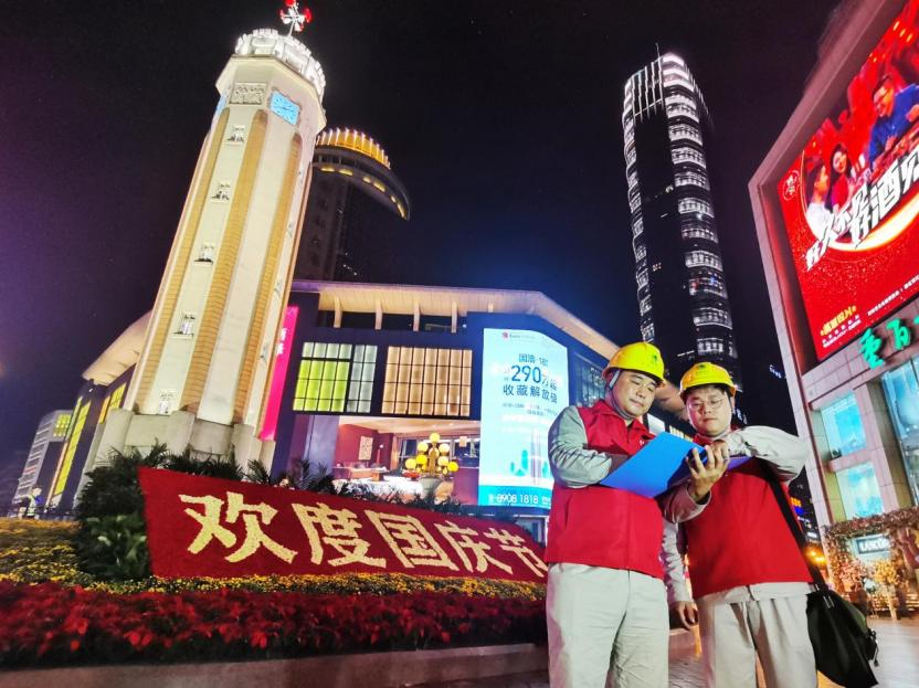 國(guó)網(wǎng)重慶市區(qū)供電公司員工在解放碑商圈巡查線(xiàn)路設(shè)備。