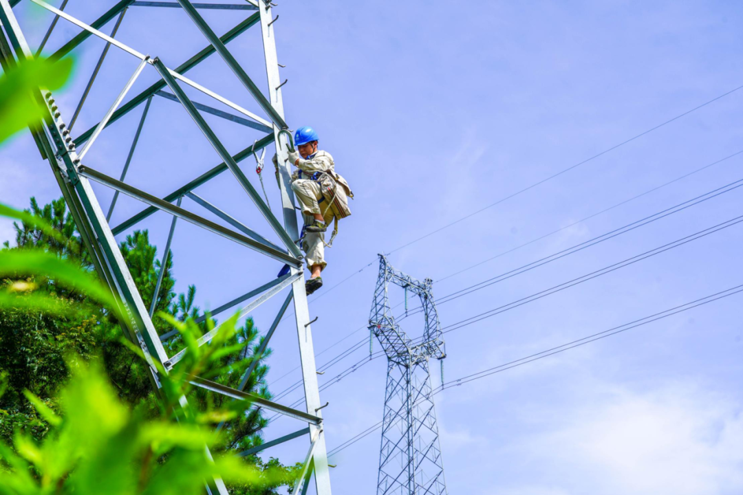 ▲國網(wǎng)重慶電力員工頂著烈日登塔檢查,保障迎峰度夏電力可靠供應(yīng)