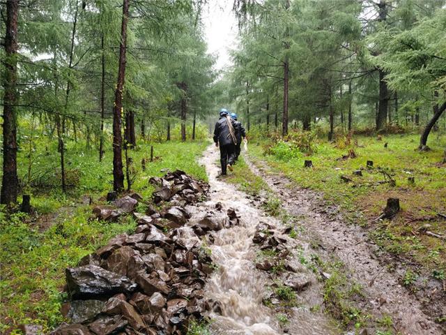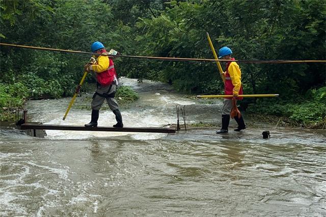 國網(wǎng)吉林送變電公司員工冒雨巡護(hù)山區(qū)線路。