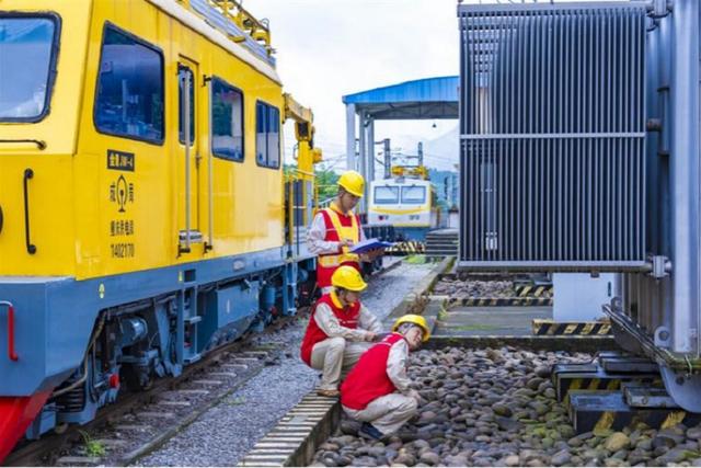 國家電網(wǎng)重慶電力紅巖(長壽園區(qū))共產黨員服務隊隊員對晏家火車牽引站開展安全用電檢查。