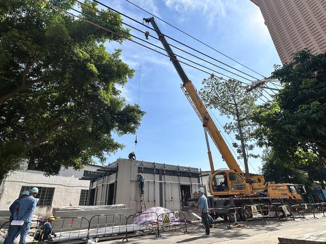 在施工技術(shù)上,江門蓬江供電局不僅引入了自動化挖掘機、起重機、混凝土攪拌車等機械,還摒棄傳統(tǒng)配電站的磚瓦結(jié)構(gòu),采用高強度、輕質(zhì)、耐腐蝕的成品預制墻板及鋼結(jié)構(gòu)等新型建筑材料,結(jié)合裝配式施工工藝,減少以往現(xiàn)場焊接、切割等工藝帶來的環(huán)境污染,大大縮短了施工周期,還減少建筑垃圾的產(chǎn)生。“與傳統(tǒng)純?nèi)斯な┕し绞较啾?,本工程機械化率達到85%,工期壓縮了80%,大大減少了對附近居民的影響,也降低了施工過程中的安全隱患。”羅益榮說。