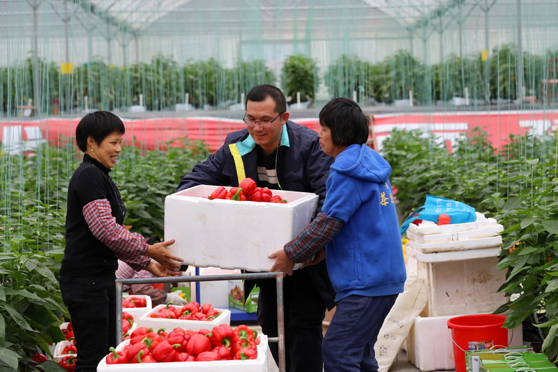 大棚種植基地迎來(lái)豐收喜悅,小婷媽媽和高鋒一起搬運(yùn)豐收的彩椒。孫嘉彪 攝