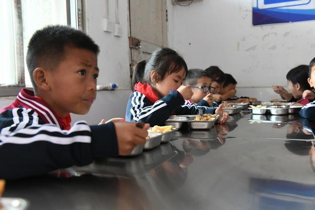 洛麥小學(xué)學(xué)生用捐贈的餐盤吃飯。龍定錦攝