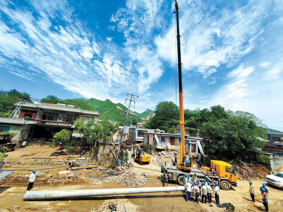 平谷區(qū)支援團隊在青龍湖鎮(zhèn)北車營村,拆除舊的電桿和設(shè)備,重新立桿和新裝變壓器。楊雙奇 攝